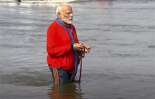 संगम में स्नान कर माला का जाप करते पीएम मोदी। पीटीआई