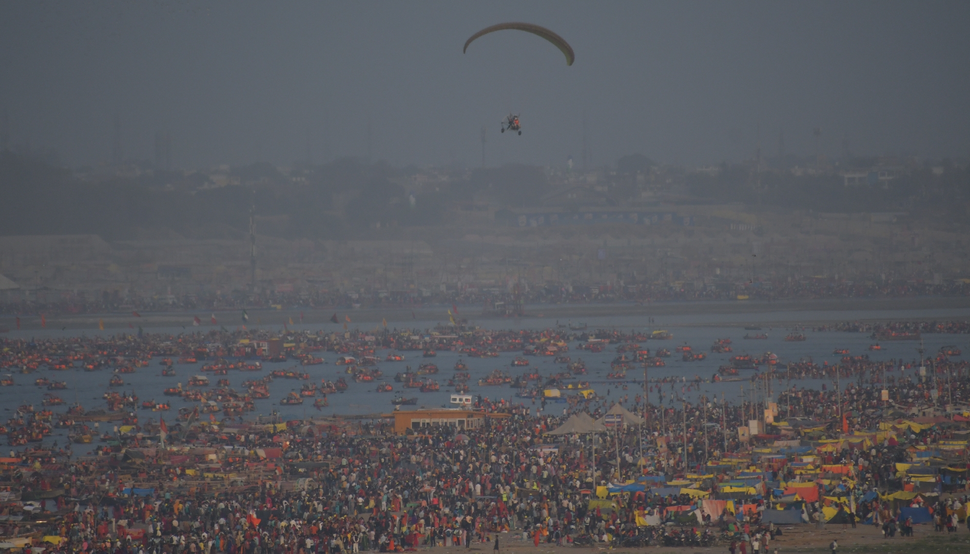 Maha Kumbh 2025 संगम पर पैरा गलाइडिंग करते श्रद्धालु। -गिरीश श्रीवास्तव