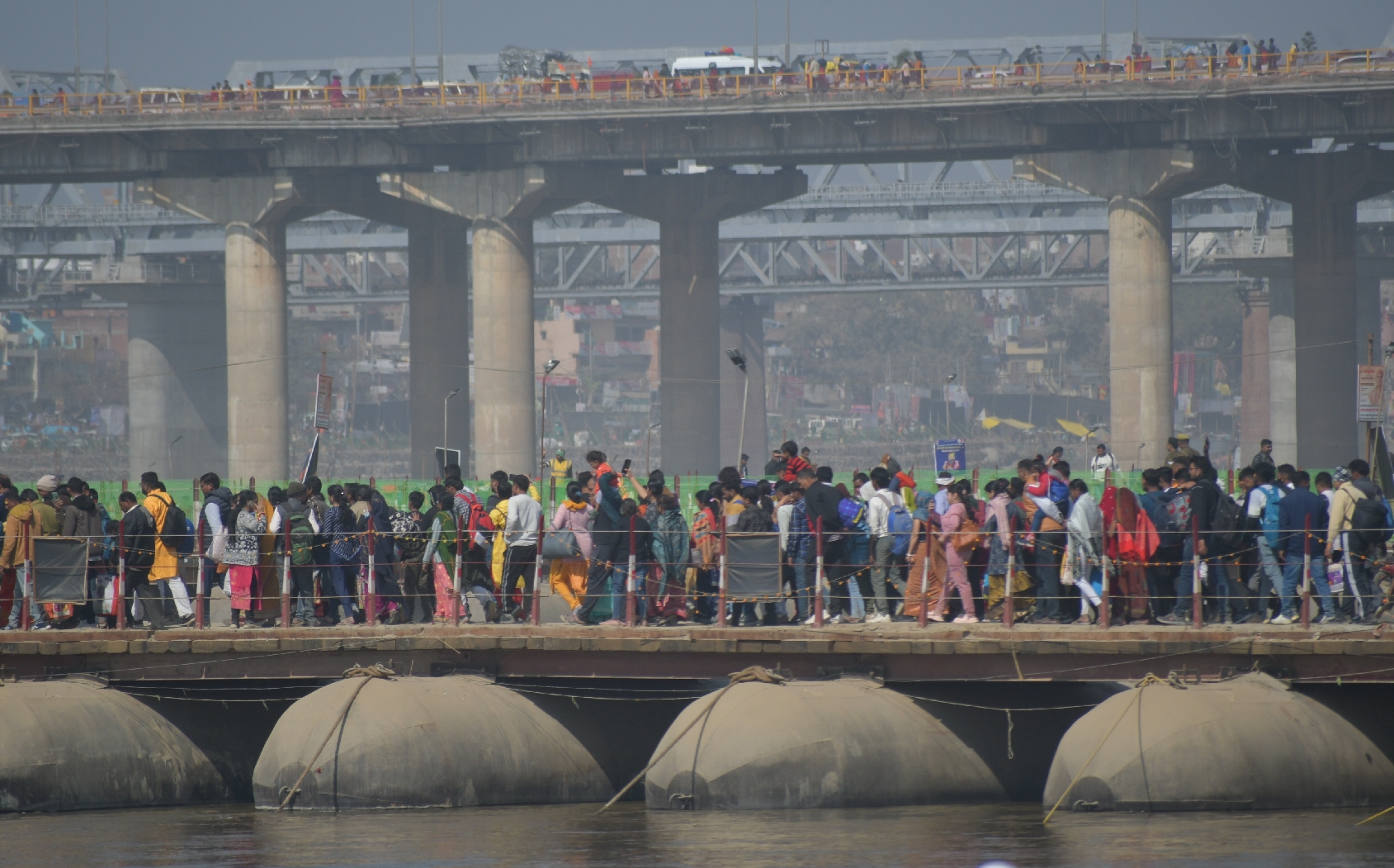 महाकुंभ मेला के पीपा पुल से गुजरते श्रद्धालु।-गिरीश श्रीवास्तव