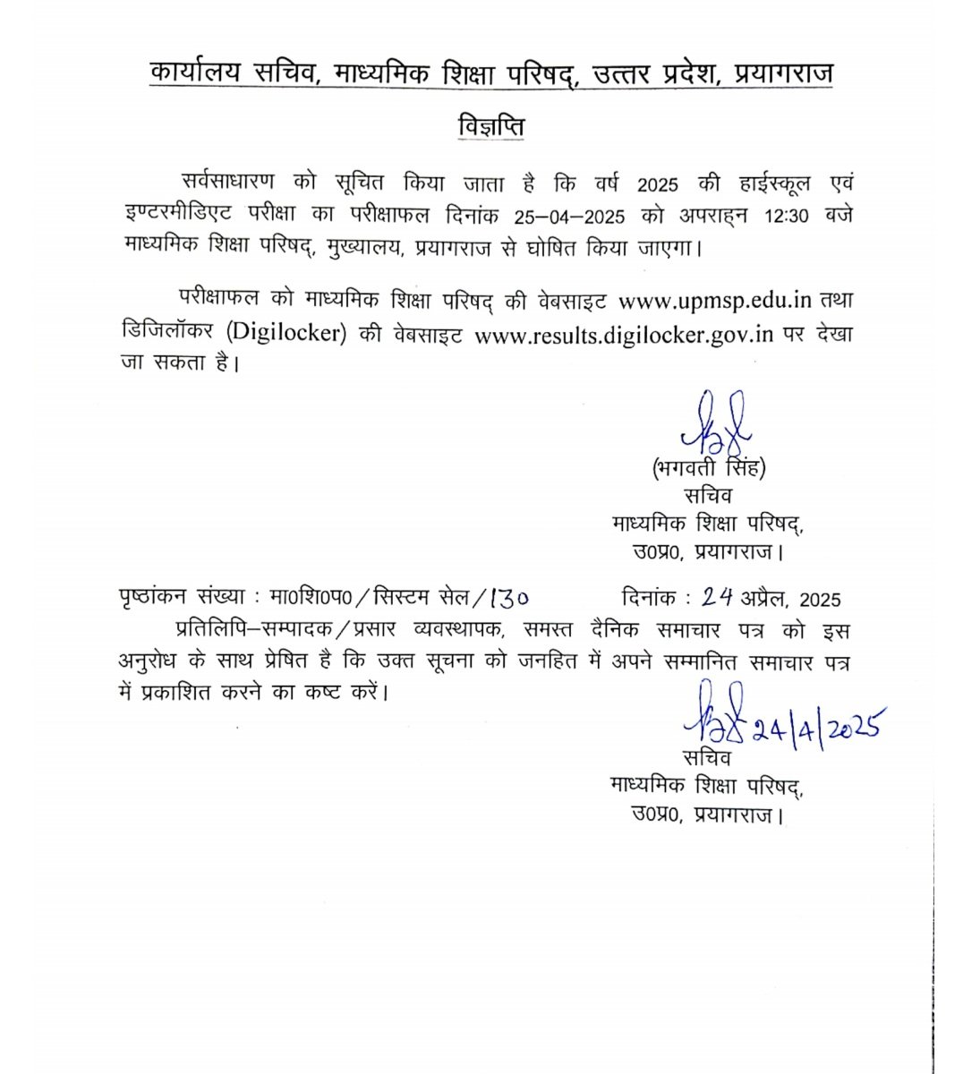 जागरण संवाददाता, प्रयागराज। यूपी बोर्ड की हाईस्कूल एवं इंटरमीडिएट परीक्षा-2025 का परिणाम 25 अप्रैल को यूपी बोर्ड मुख्यालय प्रयागराज से जारी किया जाएगा। पहली बार होगा कि परीक्षा परिणाम जारी किए जाने के बाद अंकपत्र/प्रमाणपत्र डिजिलॉकर पर उपलब्ध कराया जाएगा।