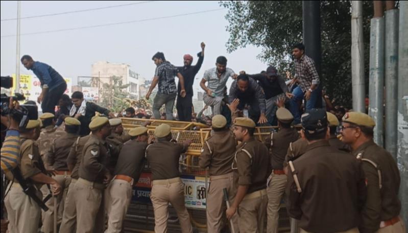 लोक सेवा आयोग चौराहे पर छात्रों को रोकने पर बैरिकेडिंग के ऊपर चढ़ कर गुजरते प्रतियोगी। जागरण