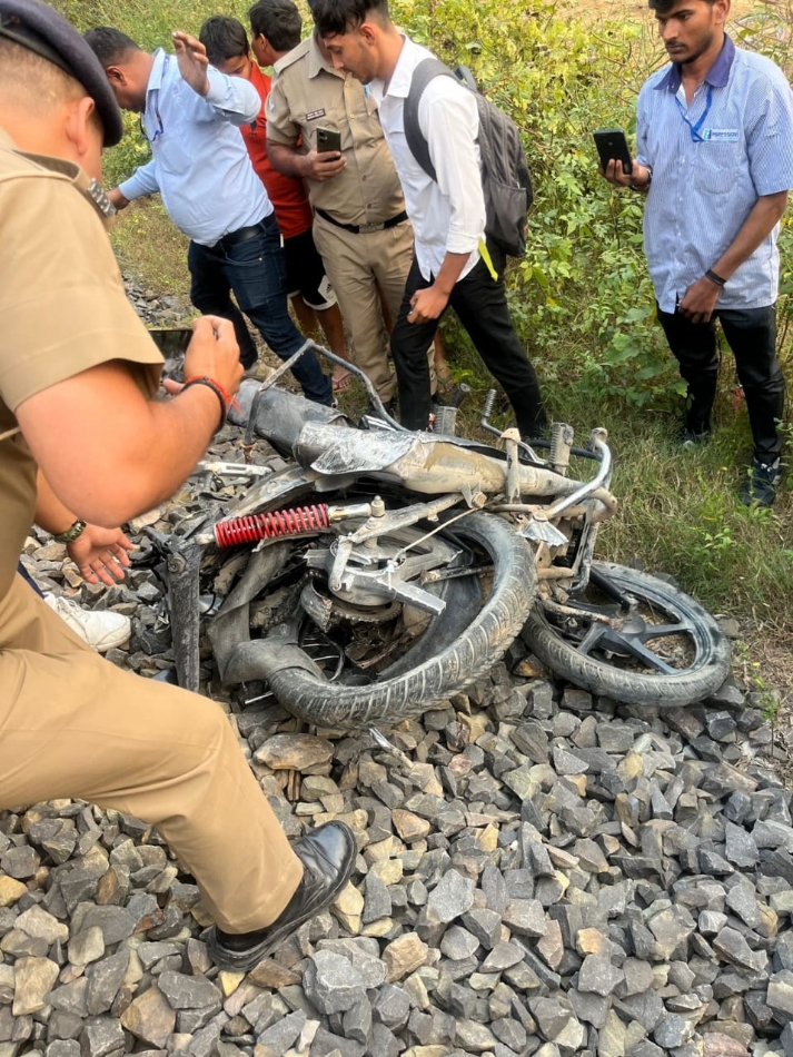 वाराणसी-प्रयागराज रेल मार्ग पर बंधवा ताहिरपुर रेलवे क्रासिंग पर वंदेभारत में फंसने के बाद क्षतिग्रस्त बाइक। सौ. रेल कर्मी