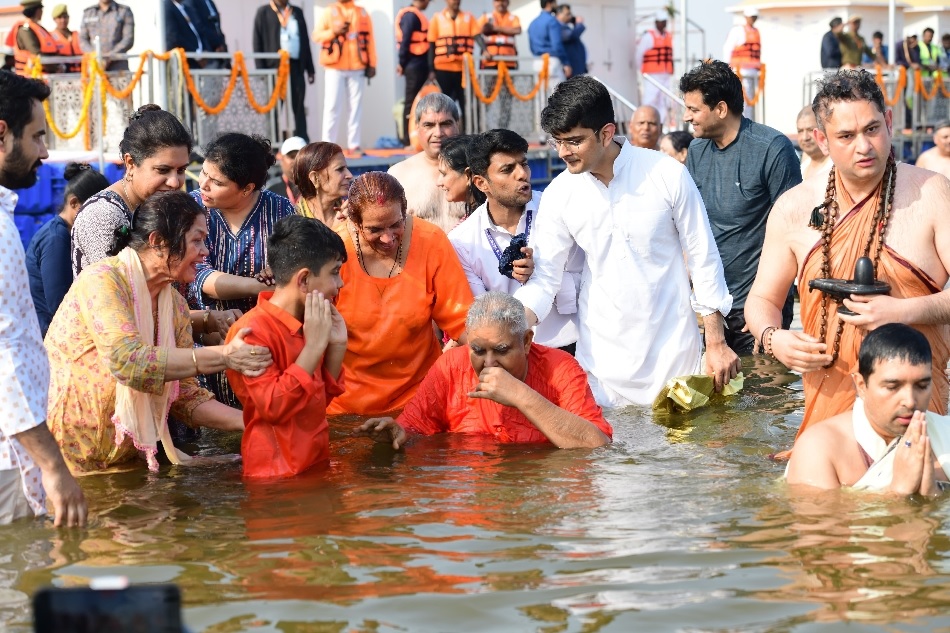 उपराष्ट्रपति धनखड़ पत्नी सुदेश धनखड़ व परिवार समेत शनिवार दोपहर लगभग एक बजे प्रयागराज के बमरौली एयरपोर्ट पर पहुंचे, जहां से हेलीकाप्टर से वह महाकुंभ नगर में डीपीएस हेलीपैड पर उतरे। यहां मुख्यमंत्री योगी आदित्यनाथ ने अंगवस्त्र ओढ़ाकर उनका स्वागत किया और उन्हें साथ लेकर क्रूज से संगम तक गए।