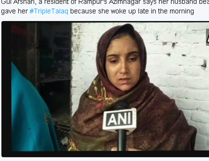 रामपुर के अजीम नगर थाना क्षेत्र के सैदनगर में एक शौहर अपनी बीबी के सुबह देर से उठने को लेकर इतना खफा हो गया कि तीन तलाक दे दिया। पति ने सिर्फ इसलिए पत्नी को तलाक दे दिया क्योंकि वह देर से सोकर उठी थी। पत्नी को तलाक देने के बाद पति उसे घर से निकालकर ताला लगाकर फरार हो गया। पीडि़त की फरियाद सुनने के बाद एक्शन में आई पुलिस ने महिला को ताला तोड़कर घर में अंदर घुसाया।