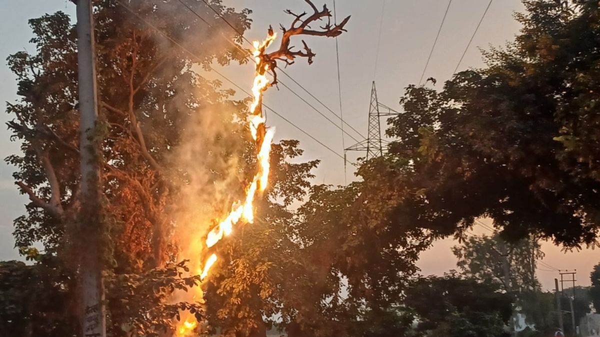 हाईटेंशन बिजली लाइन की चिंगारी से जला पेड़