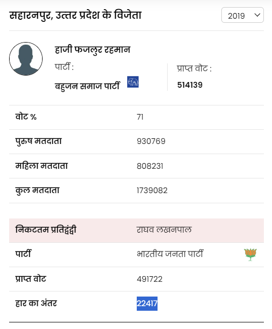 2019 में हाजी फजलुर रहमान बने थे सांसद (Saharanpur lok sabha chunav 2019 Winner)