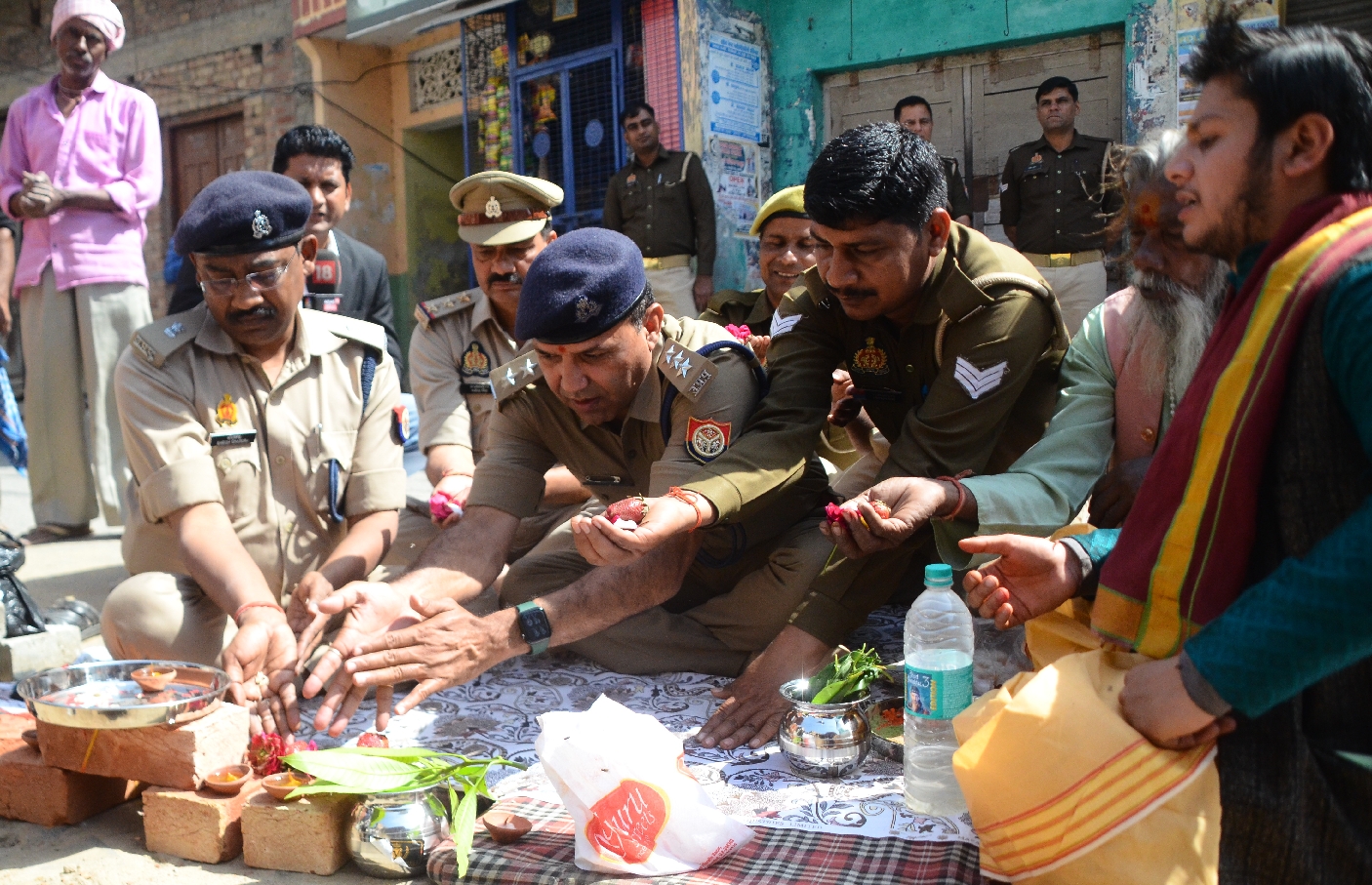 संभल के दीपा सराय चौक में पुलिस चौकी निर्माण के लिए भूमि पूजन करते एएसपी, सीओ, इंस्पेक्टर व अन्य पुलिस कर्मी। जागरण