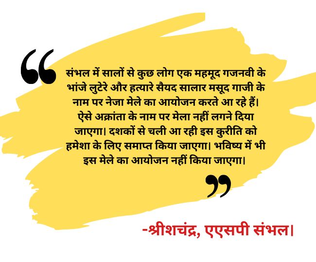 यहां पर सैकड़ों साल से नेजा मेले का आयोजन किया जाता रहा है। इस बार के लिए करीब दस दिन पहले भी एसडीएम को मेला आयोजन के बारे में सूचना देकर 18 मार्च को ढाल गाढ़े जाने तथा 25 से 27 मार्च तक नेजा मेला लगाए जाने के बारे में अवगत कराया गया था। सोमवार को कोतवाली में बैठक के दौरान एएसपी ने कहा कि सालार मसूद गाजी की याद में कोई मेला नहीं लगाने दिया जाएगा। अब हम उच्चाधिकारियों से मिलकर अपनी बात रखते हुए समस्या समाधान की मांग करेंगे। जहां सैकडों साल पुराने इस नेजा मेला को कराने की बात कही जाएगी। होली के बाद पहले मंगलवार को नेजा ढाल गाढ़े जाने की प्रथा चली आ रही है। हमने इतिहास नहीं पढ़ा है। ऐसे में जो कोई कुछ कहता है कहता रहे। हम इस बात को नहीं मानते हैं। शाहिद हुसैन मसूदी, अध्यक्ष धार्मिक नगर नेजा कमेटी संभल