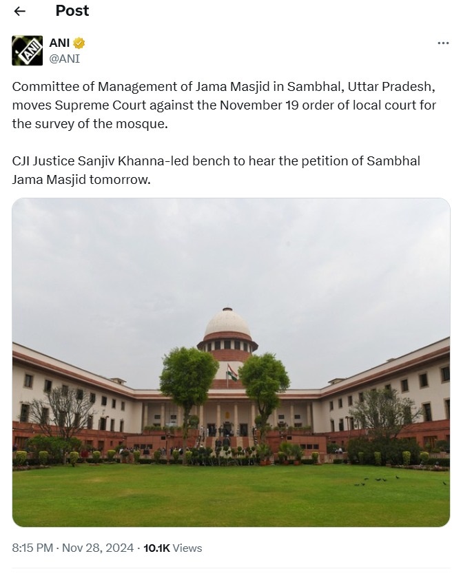 CJI Justice Sanjiv Khanna-led bench to hear the petition of Sambhal Jama Masjid tomorrow. pic.twitter.com/bNjlqSfiVM