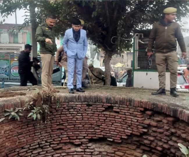 संभल के सौधन में किले के पास बने कुएं को देखते डीएम डॉक्टर राजेंद्र पैंसिया व एसपी कृष्ण कुमार विश्नोई। जागरण