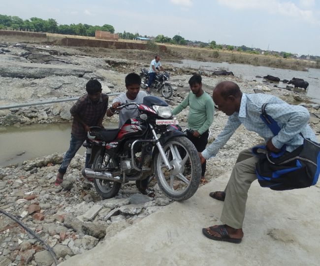 बाढ़ के कारण सड़क कटने से दोपहिया वाहन निकालते लोग।