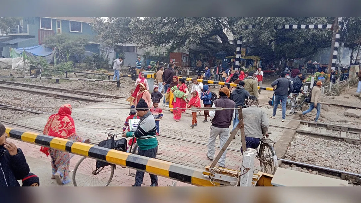 बंद रेलवे फाटक के नीचे से निकलते लोग