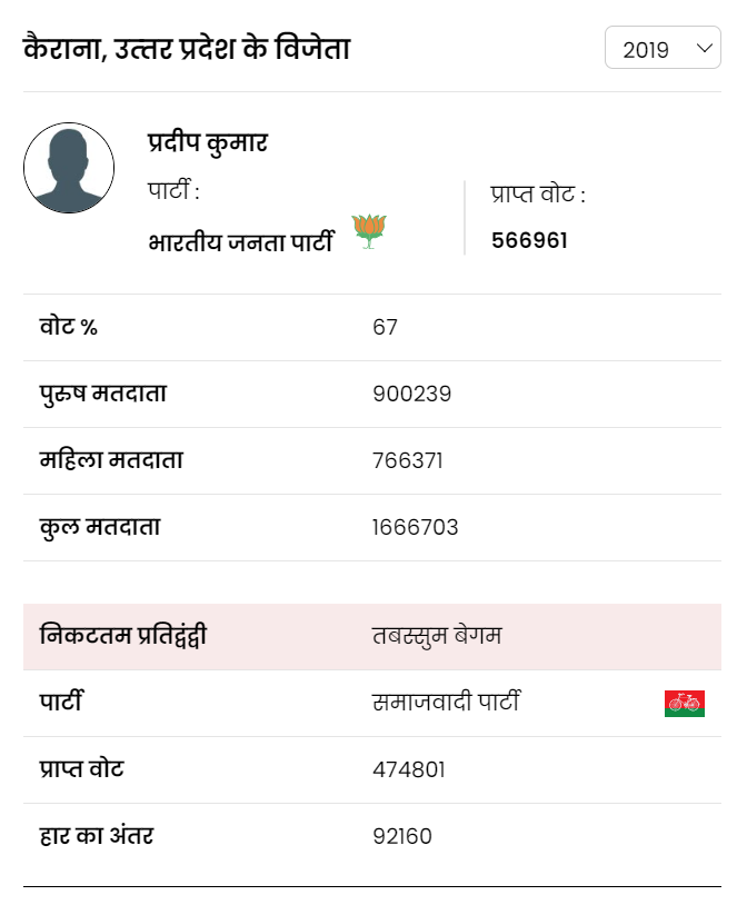 2019 में कैराना की जनता ने 566961 वोटों के साथ भाजपा के प्रदीप कुमार को विजयी बनाया था। प्रदीप कुमार ने सपा की तबस्सुम बेगम को 92160 वोटों से हराया था। तबस्सुम बेगम को 474801 वोट प्राप्त हुए थे।