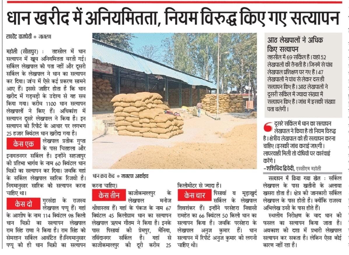 धान खरीद में गड़बड़ी में उजागर किया था कि लेखपालों ने दूसरे सर्किल में धान की फसल का सत्यापन कर दिया। जिनके नाम जमीन नहीं थी, उनके नाम धान सत्यापन दर्शाया गया। जिस खेत में गन्ने का सर्वे था, उसमें धान दिखाया गया। लाखों रुपये का धान बिक्री कर भुगतान कर दिया गया। प्रकरण में एसडीएम ने कई लेखपालों को नोटिस जारी कर स्पष्टीकरण मांगा था। जांच तहसीलदार को सौंपी गई थी। इसकी जांच अभी तक चल रही थी।
