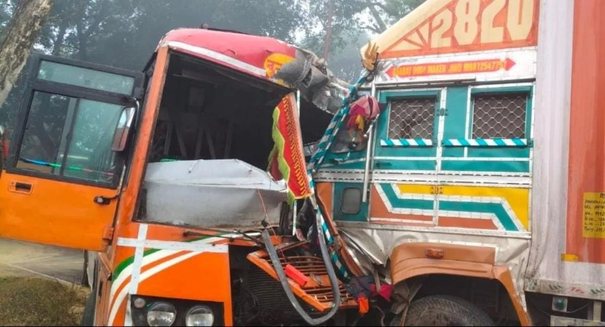 कोहरे के कारण आपस में भीड़े कंटेनर और रोडवेज बस। जागरण