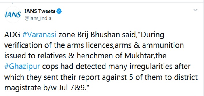 वाराणसी जोन के एडीजी बृज भूषण का कहना है कि मुख्तार के रिश्तेदारों और गुर्गे को जारी किए गए हथियारों के लाइसेंस, हथियार और गोला-बारूद के सत्यापन के दौरान ग़ाज़ीपुर पुलिस ने कई अनियमितताओं का पता लगाया था और उन्होंने उनमें से 5 के खिलाफ अपनी रिपोर्ट जिला मजिस्ट्रेट को भेजी थी। इसके बाद शस्त्र निलंबन की कार्रवाई की गई। गाजीपुर के पुलिस अधीक्षक डा. ओमप्रकाश सिंह ने बताया कि मुख्तार अंसारी के करीबियों के कब्जे से अबतक 39 करोड़ 80 लाख रुपये की संपत्ति मुक्त कराई जा चुकी है। 33 शस्त्र लाइसेंस को भी निलंबित कर विभिन्न मालखाने में जमा करा दिए गए हैं। शासन के निर्देश पर यह कार्रवाई निरंतर चल रही है और आगे भी जारी रहेगी।