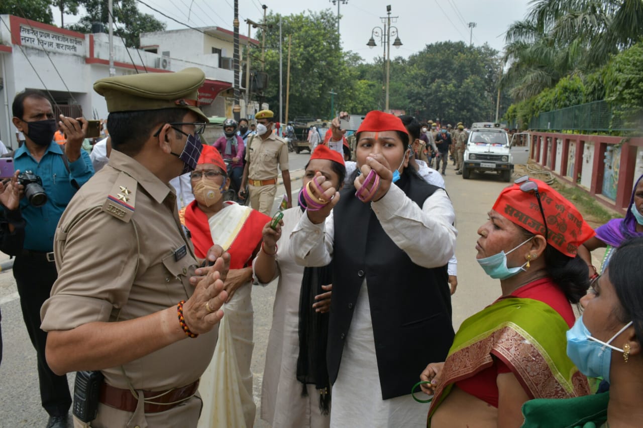 कांग्रेस और समाजवादी पार्टी कार्यकर्ताओं ने केंद्रीय मंत्री स्मृति ईरानी काे वाराणसी में दी चूड़ियां