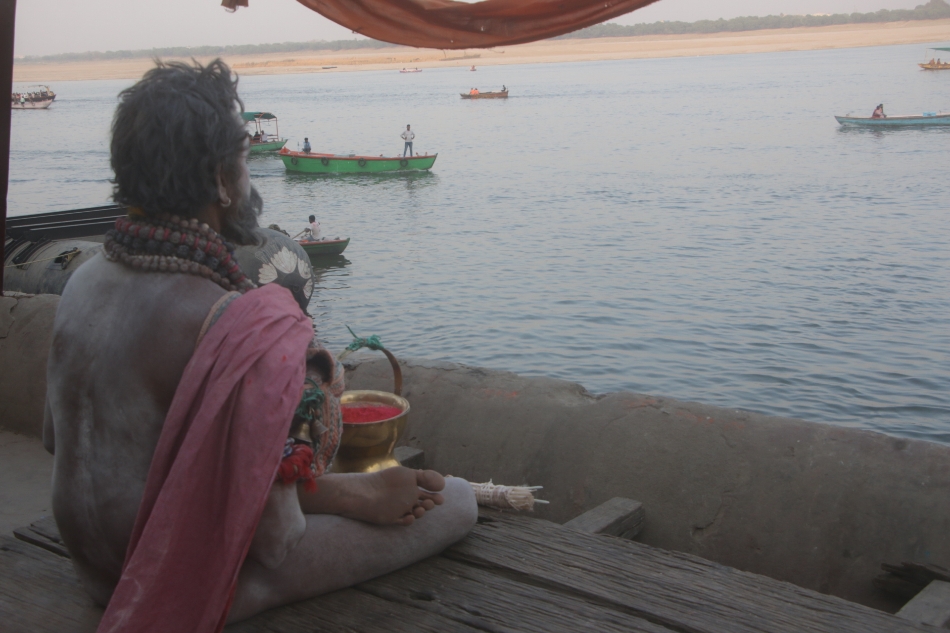 तुलसी घाट पर नागा संन्यासी साधु ध्यान लगाता। जागरण