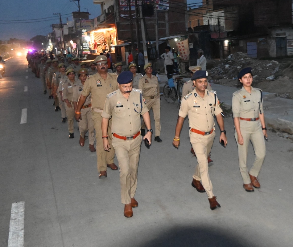 लोहता कस्बा में अपर पुलिस आयुक्त कानून-व्यवस्था और मुख्यालय (डीआइजी) पैदल मार्च कर सुरक्षा का संदेश देते हुए: स्रोत पुलिस