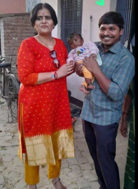 नीरज के घर गांगकला में छोटे बच्चे को खिलाते हुए ट्रस्टी दीपा वेंकेट व नीरज।