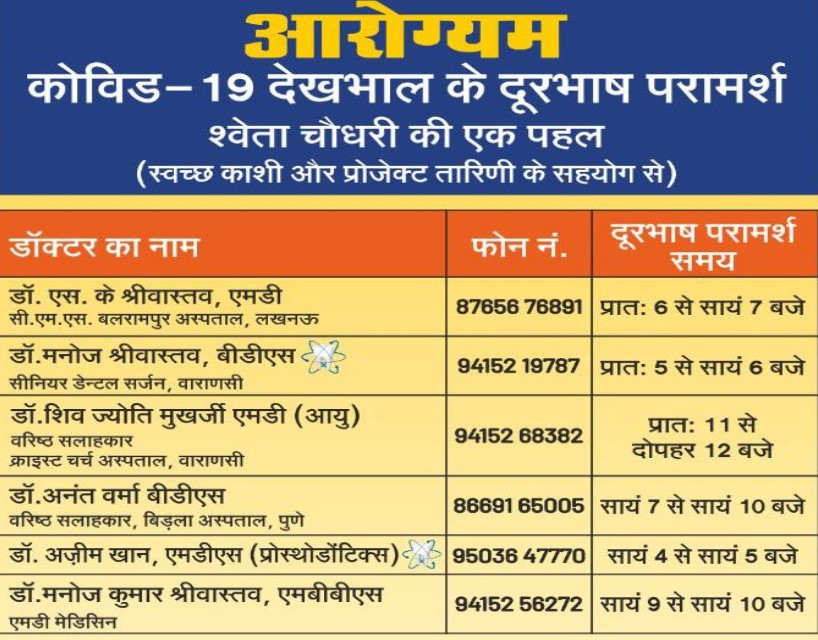 ब्रिजकिशोर स्टूडेंट एजुकेशन एंड वेलफेयर सोसाइटी की कोविड से लड़ने वालीं शाखा स्वच्छ काशी एवं मिसेज इंडिया श्वेता चौधरी की महत्वपूर्ण योजना तारनी के निर्देशन में आरोग्यम टेली कंसल्टेशन का शुभारंभ बीते बुधवार को किया गया था। उन्होंने बताया कि ये सेवा निःशुल्क भारत वर्ष के नागरिकों के लिए हैं। कोई भी दिये गये डाक्टर के दूरभाष पर संपर्क कर अपनी समस्या का निदान ले सकता है। यह संस्था पिछले कई वर्षों से काशी से लेकर पूरे भारत में कार्य कर रही है। संस्था ने कोविड-19 में गरीब असहाय, लोगों को हाॅस्पिटल में बेड दिलाकर निःशुल्क इलाज भी कराया है।