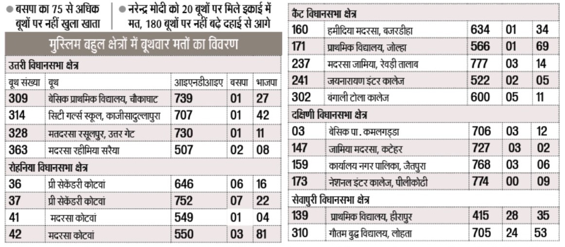 कैंटोमेंट में भी कुछ हिस्सा मुस्लिम बहुल है। वाराणसी में करीब 3.52 लाख मुस्लिम मतदाता हैं। इन मतदाताओं ने भाजपा को पूरी तरह से नकार दिया। उसे 20 स्थानों पर इकाई में और 180 स्थानों में दहाई अंकों में मिले मतों से संतोष करना पड़ा।