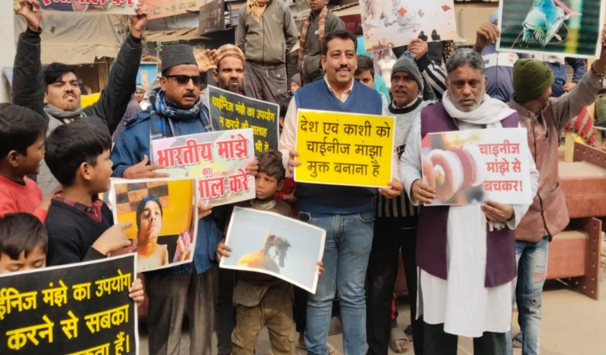 वाराणसी में कई लोगों के घायल होने के बाद, चीनी मांझे के खिलाफ विरोध प्रदर्शन हुआ।
