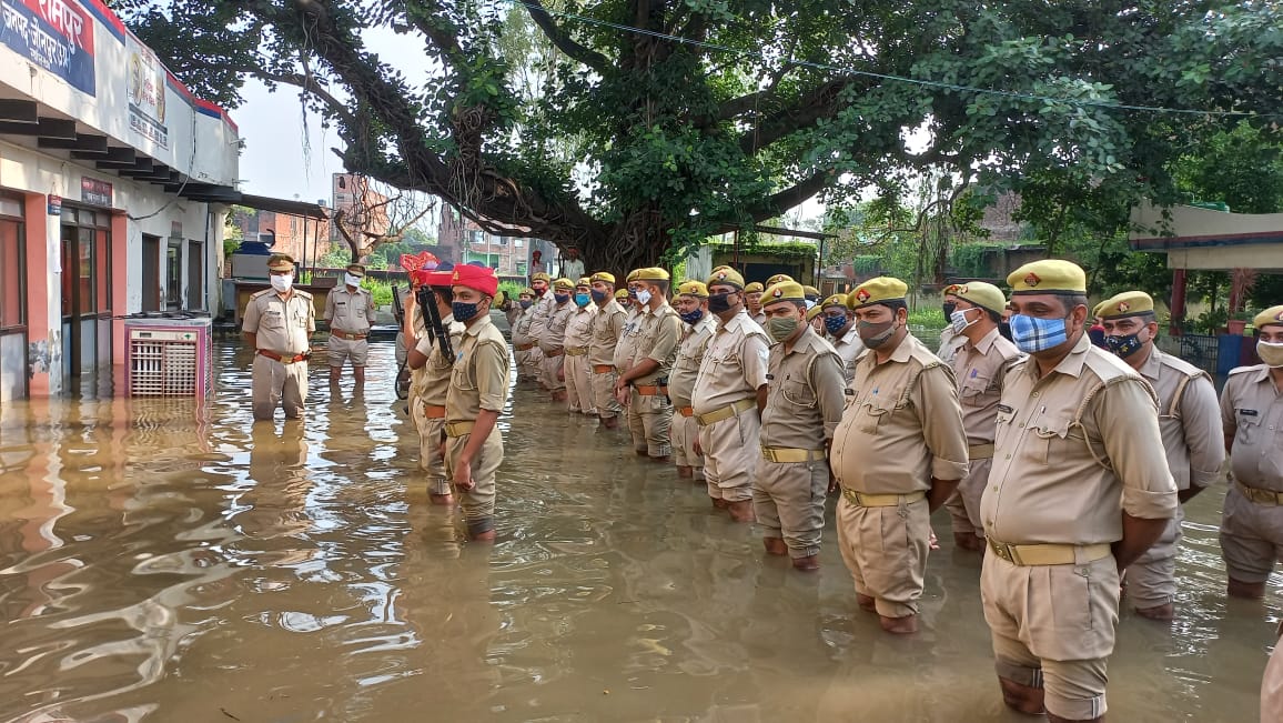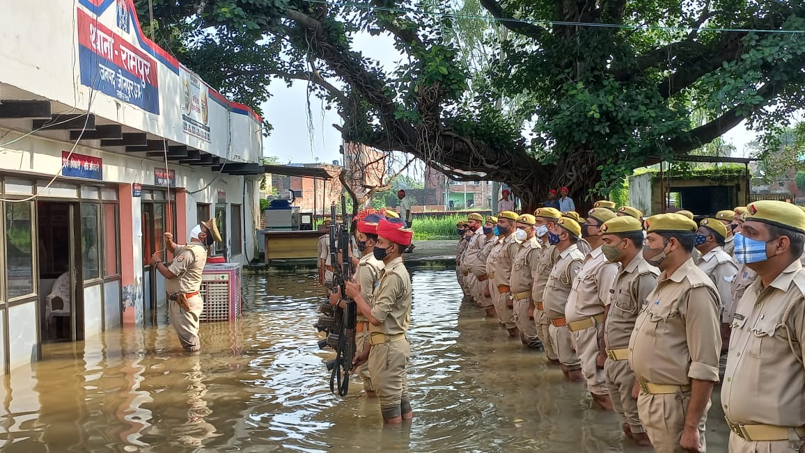 बीते दिनों से हो रही जोरदार बरसात की वजह से कई निचले इलाके बाढ़ और बारिश के पानी में डूबे हुए हैं। इसी कड़ी में जौनपुर जिले में रामपुर थाना परिसर में भी बारिश का पानी काफी भरा होने की वजह से झंडारोहण पानी के बीच में ही करके परंपराओं का निर्वहन किया गया। बारिश के पानी मे खड़े होकर पुलिस के जवानों ने झंडारोहण किया और सलामी देने के साथ ही तिरंगे का मान और अभिमान बारिश और पानी के बीच भी कम नहीं होने दिया। परिसर में घुटनों तक भरे पानी में दर्जन भर से अधिक पुलिसकर्मी कपड़ों के भीगने की परवाह न करते हुए पूरे झंडारोहण की परंपराओं को निर्वहन करते नजर आए। तिरंगा फहराने के साथ बीतते हर घड़ी हर क्षण गर्व की अनुभूति से सभी पुलिस कर्मियों का सीना भी चौड़ा नजर आया।