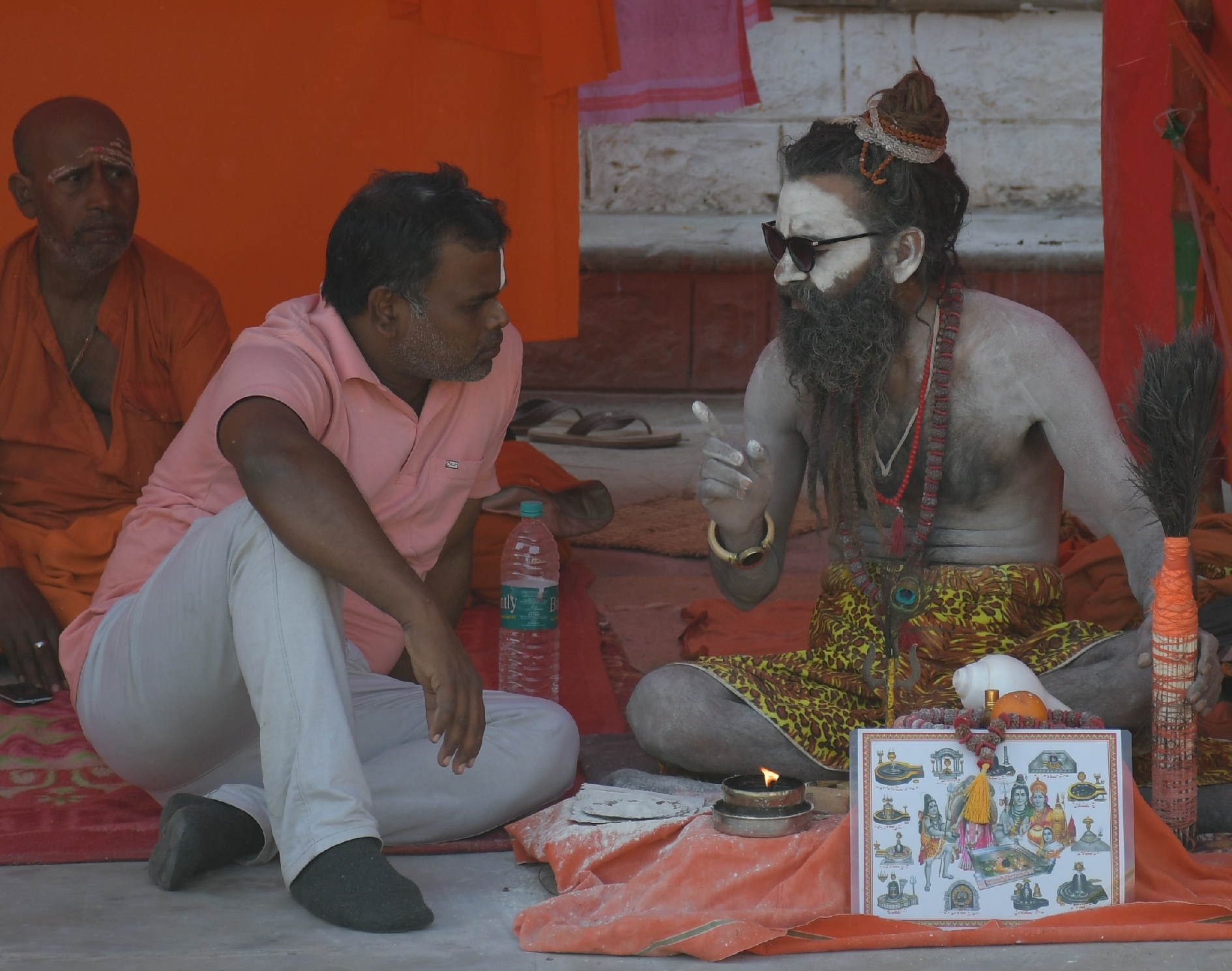 कर्नाटक स्टेट घाट पर लोगों से बात करते साधु। जागरण