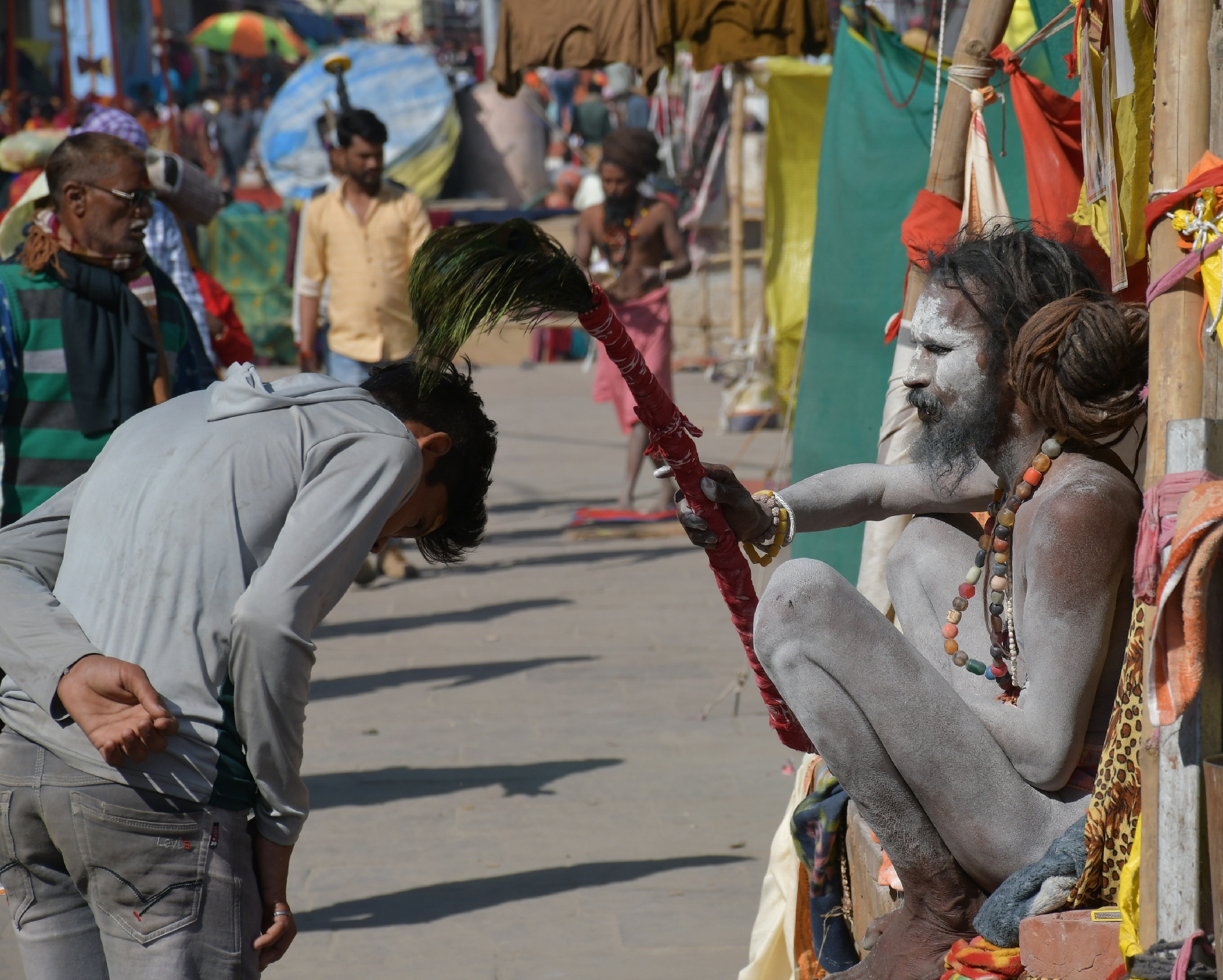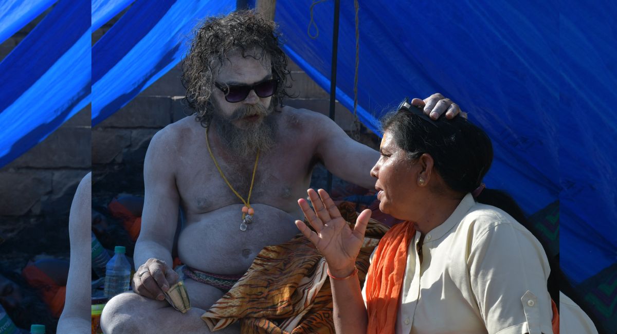 केदारघाट पर महिला को आर्शीवाद देता नागा साधु। जागरण