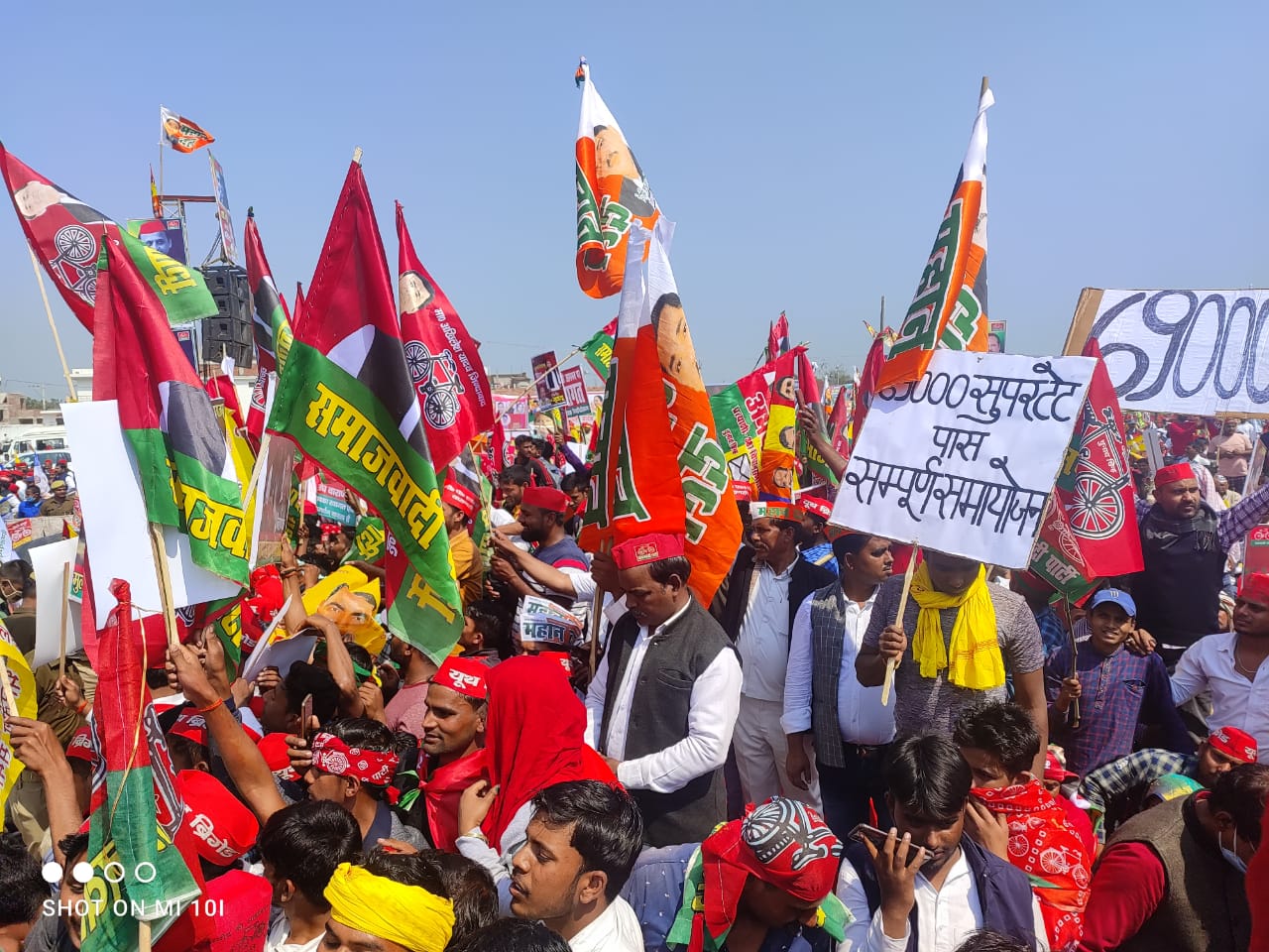 विधानसभा चुनाव के सातवें चरण के लिए गुरुवार को वाराणसी में आयोजित सपा की रैली में राष्ट्रीय अध्यक्ष अखिलेश यादव, पश्चिम बंगाल की मुख्यमंत्री ममता बनर्जी के साथ ही सुभासपा अध्यक्ष ओमप्रकाश राजभर, राष्ट्रीय लोकदल अध्यक्ष जयंत चौधरी, अपना दल कमेरावादी की अध्यक्ष कृष्णा पटेल, प्रसपा प्रमुख शिवपाल यादव व सपा नेता शामिल हो रहे हैं। वहीं समाजवादी पार्टी के वरिष्ठ नेता किरणमय नंदा व प्रमुख महासचिव रामगोपाल यादव पहले से बनारस पहुंच चुके हैं। मंच पर प्रगतिशील समाजवादी पार्टी के अध्यक्ष शिवपाल यादव पहुंचे तो मंच पर चढ़ते ही उन्होंने रामगोपाल यादव का पैर छूकर आशीर्वाद लिया। वहीं वाराणसी की सभी आठों सीटों के प्रत्याशी भी मंच पर इस दौरान उपस्थित रहे।