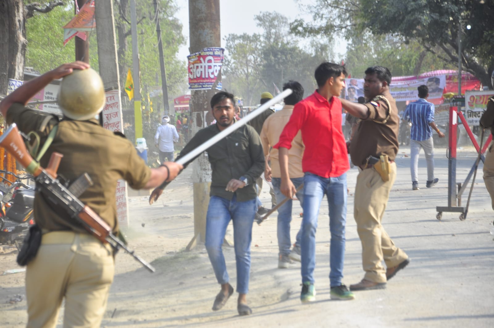 शांति व्यवस्था को तैनात पुलिस कर्मियों ने रोकना चाहा तो सपा व भाजपा कार्यकर्ता आपस में पथराव करने लगे। ईंट-पत्थर चलने से कई सुरक्षाकर्मी भी घायल हो गए। पुलिसकर्मियों ने सीआरपीएफ व पीएसी बल के जवानों को बुला लिया। सीआरपीएफ, पुलिस व पीएसी के जवानों ने स्थिति नियंत्रित करने के लिए बल प्रयोग शुरू कर दिया। प्रत्यक्षदर्शियों के अनुसार सुरक्षाबलों ने कुछ घरों में घुसकर महिलाओं की भी पिटाई कर दी। इसे लेकर लोगों में भारी गुस्सा है। इसी दौरान मतगणना स्थल पर जा रहे जिलाधिकारी मनीष कुमार वर्मा व वरिष्ठ पुलिस अधीक्षक अजय कुमार साहनी रास्ते में कुछ देर रुके रहे। स्थिति सामान्य होने के बाद वह मतगणना स्थल पर गए।