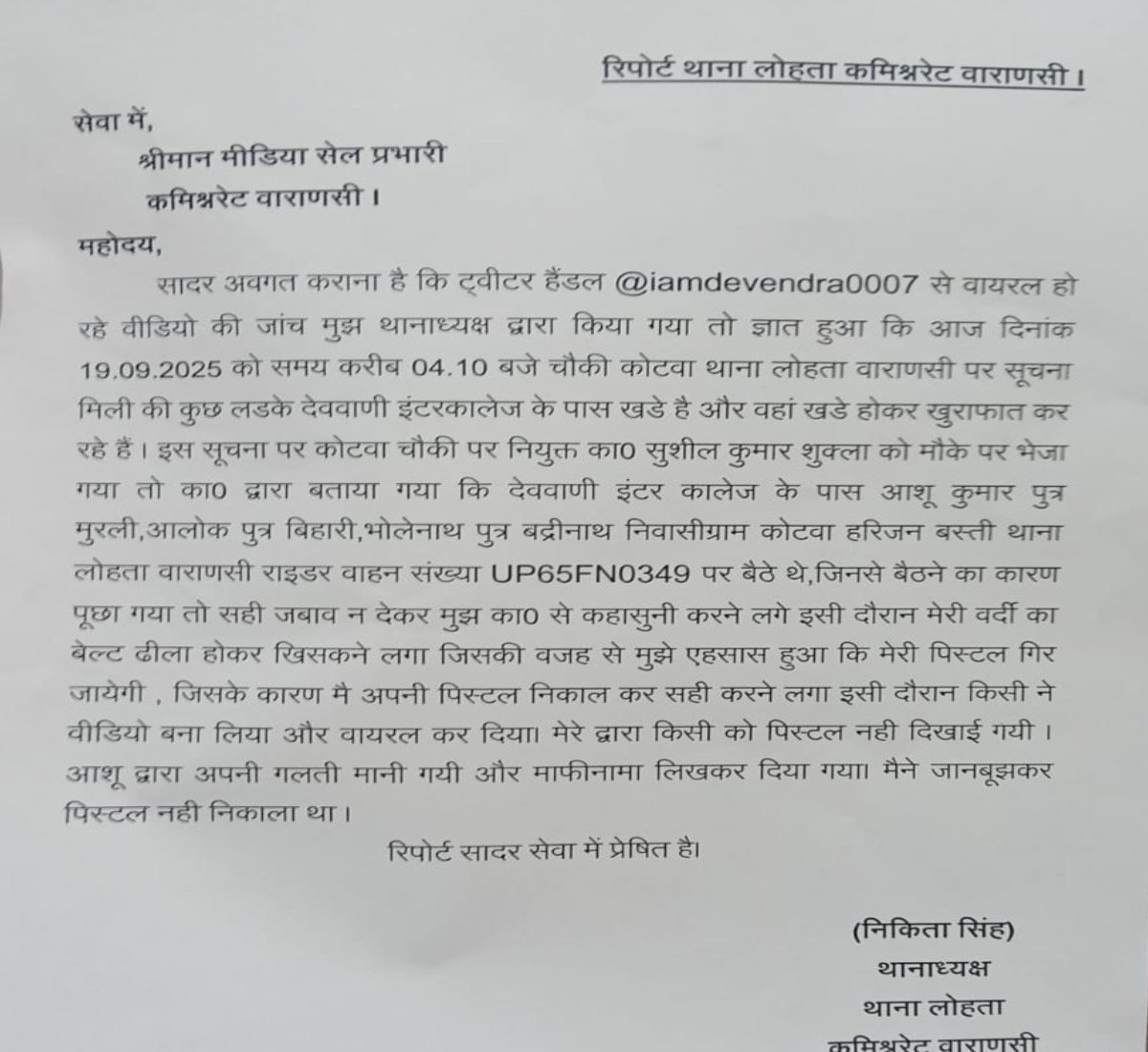 लेकिन उसके बाद भी वह नहीं माने हमें जबरदस्ती चौकी ले जाने लगे तो हम विरोध किए तो वह हमारे ऊपर धमकाते हुए पिस्टल निकाल दिए। चौकी पर फोन करके चौकी इंचार्ज और सिपाही को बुला लिए। उसके बाद हमें चौकी पर ले जाकर मारे तथा हमसे माफी मंगवाकर शाम को छोड दिया। इस बाबत उस समय तो थानाध्यक्ष निकिता सिंह ने बताया कि पिस्टल सटाने की बात गलत है। आपस में मारपीट हुई थी। जिसको पकड़कर पुलिस पुछताछ करने गई थी। प्रश्न यह भी है कि किशोर से पुलिस को कैसी पूछताछ करनी थी वो भी चौकी ले जाकर यह स्पष्ट नहीं हो सका।