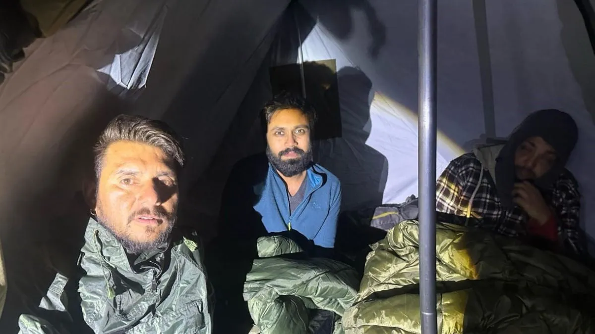 ज्योतिर्मठ के क्वारी पास ट्रेक पर फुलारा कैंप में मौजूद दिल्ली का पर्यटक शिवम गुप्ता (बीच में)। साभार-वन विभाग