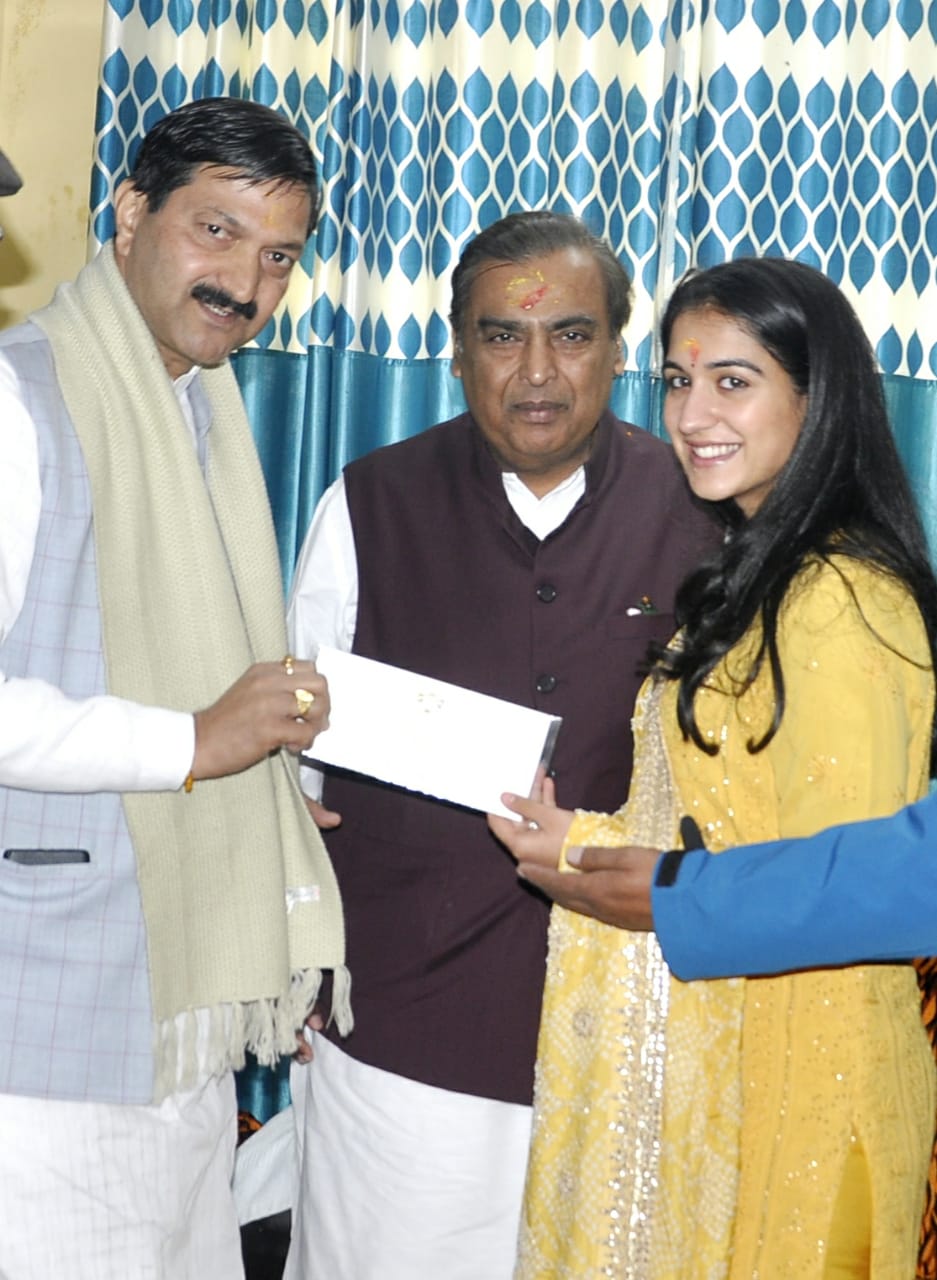 मुकेश अंबानी और उनकी छोटी बहू ने पांच करोड़ का चेक बीकेटीसी के अध्यक्ष अजेंद्र अजय को सौंपा।
