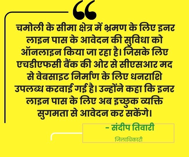 ऐसे में पर्यटकों और श्रद्धालुओं की आवेदन में हो रही दिक्कतों को देखते हुए चमोली जिला प्रशासन आवेदन की प्रक्रिया को ऑनलाइन सुविधा से जोड़ने का कार्य किया है। जिससे पर्यटक और श्रद्धालु अब घर बैठे ही इनर लाइन पास के लिए आवेदन कर सकेंगे।