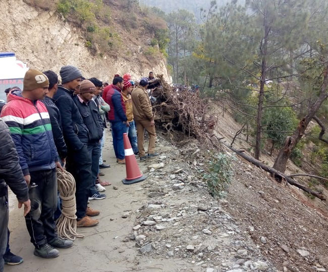 शनिवार को बाराकोट ब्लाक के मिरतोली निवासी शेर सिंह भंडारी की पत्नी खीमा देवी (65) की मौत हो गई थी। रविवार को शव लेकर 20 ग्रामीण एक वाहन से रामेश्वर घाट के लिए रवाना हुए। दोपहर 12 बजे वाहन अनियंत्रित होकर खाई में जा गिरा। वाहन में सवार गणेश सिंह बिष्ट ने किसी तरह कूद कर जान बचा ली और हादसे की सूचना फोन से पुलिस व ग्रामीणों को दी। उसे भी चोट आई है।