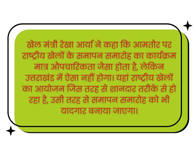 खेल मंत्री आर्या ने कहा कि आमतौर पर राष्ट्रीय खेलों के समापन समारोह का कार्यक्रम मात्र औपचारिकता जैसा होता है, लेकिन उत्तराखंड में ऐसा नहीं होगा। यहां राष्ट्रीय खेलों का आयोजन जिस तरह से शानदार तरीके से हो रहा है, उसी तरह से समापन समारोह को भी यादगार बनाया जाएगा।