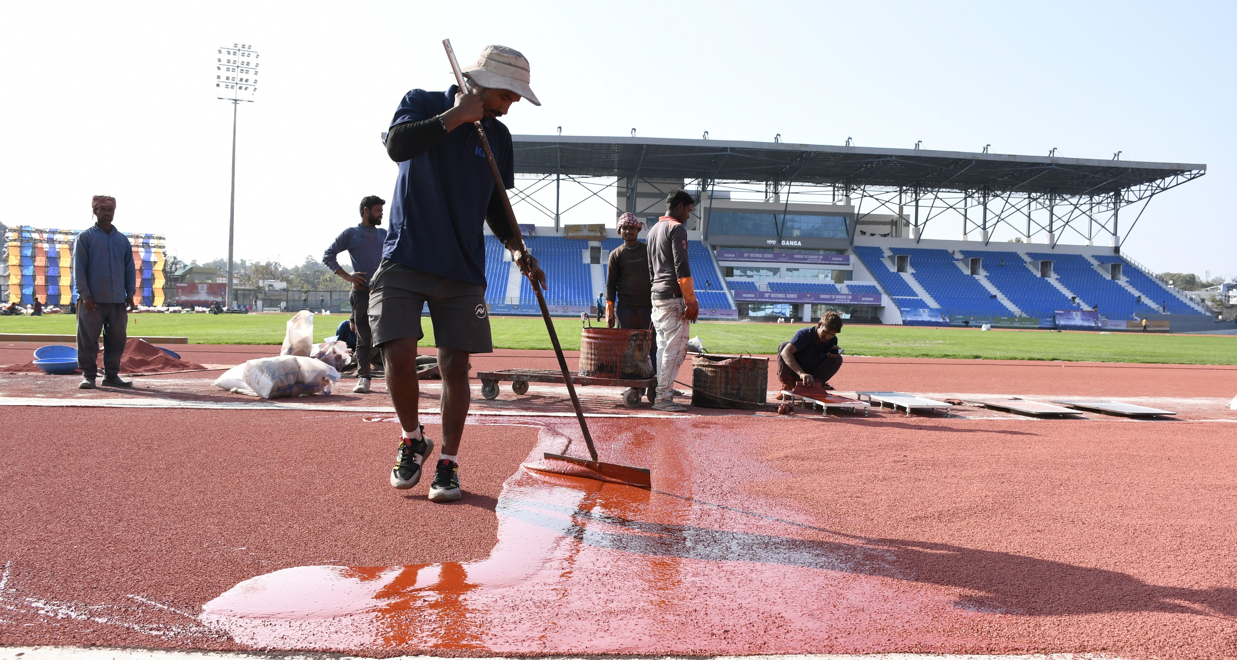 रायपुर स्पोटर्स कालेज में नवनिर्मित गंगा एथलेटिक्स ट्रेक को तैयार करते श्रमिक। जागरण