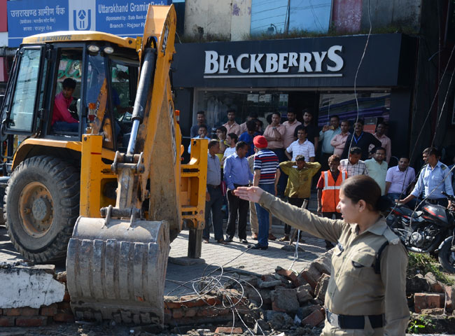 अतिक्रमण के खिलाफ अभियान को लेकर शुक्रवार को मसूरी-देहरादून विकास प्राधिकरण, पीडब्ल्यूडी, नगर निगम, जिला व पुलिस प्रशासन के अधिकारी और कर्मचारियों की टीम राजपुर रोड शनिवार को फिर से अतिक्रमण के खिलाफ अभियान चलाया। यहां पूर्व में चिन्हित अतिक्रमणों को ध्वस्त कराते हुए कई दुकानों के बोर्ड आदि डोजर ने तोड़ कर गिरा दिए। अतिक्रमण हटाने के दौरान टीम से स्थानीय दुकानदारों की तकरार भी हुई, लेकिन टीम ने ध्वस्तीकरण की कार्रवाई जारी रखी।