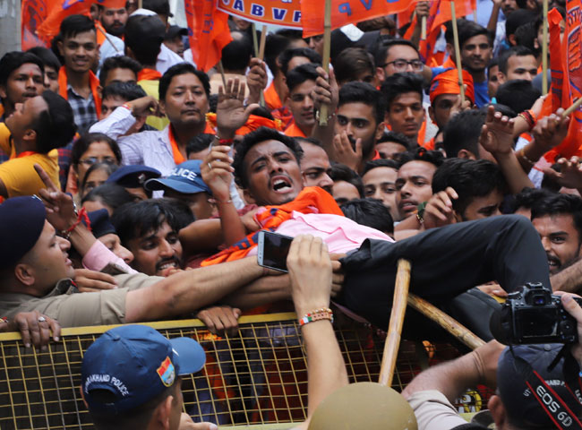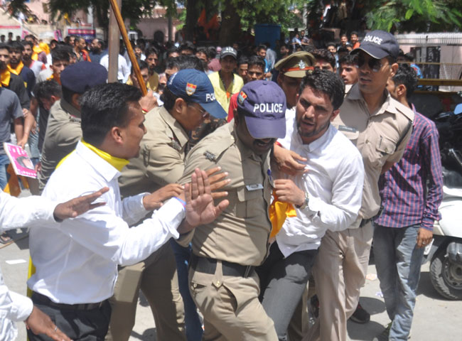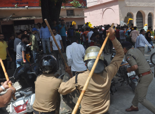छात्रों का हंगामा बढ़ता देख पुसिल ने भी आपा खो दिया। पहले तो पुलिस ने समझा-बुझाकर छात्रों को शांत कराने का प्रयास किया, लेकिन हो-हल्ला बढ़ने पर पुलिस को लाठियां फटकारनी पड़ी। इस पर संगठन के पदाधिकारी अपने कार्यकर्ताओं को शांत कराने में जुट गए। एबीवीपी के राष्ट्रीय सह संगठन मंत्री श्रीनिवास ने पुलिसकर्मियों से कहा कि आप रहने दें, हम अपने कार्यकर्ताओं को शांत कराना जानते हैं। अनुशासन एबीवीपी की पहचान है। आप लोग बीच में मत पड़िए। एक पुलिस कर्मी ने श्रीनिवास को कहा कि वे उन्हें न सिखाएं और पुलिस को अपने हिसाब से काम करने दें। जिस पर एबीवीपी के कार्यकर्ता आक्रोशित होकर पुलिस के साथ भिड़ पड़े। ऐसे में एबीवीपी के पदाधिकारियों ने कार्यकर्ताओं को शांत करवाया और पुलिस ने भी नरमी दिखाई।