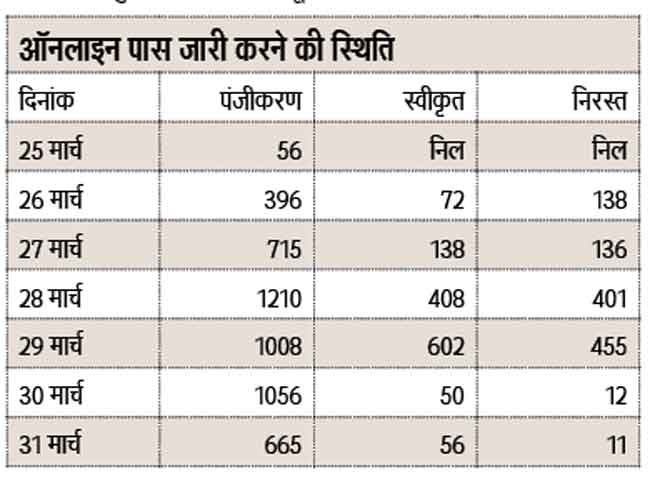 ऑनलाइन पास जारी करने के नोडल अधिकारी रामजी शरण शर्मा ने बताया कि लॉकडाउन में की गई सख्ती के बाद सिर्फ आपात स्थिति वाले लोगों को ही पास जारी किए जा रहे हैं। ऐसे लोगों के आवेदन तत्काल निरस्त कर दिए जा रहे हैं, जिनमें अन्यत्र जाने की कोई विशेष वजह नहीं है। आवेदनों का परीक्षण भी बारीकी से किया जा रहा है। पहले आपात स्थिति वाले आवेदन जांचे जा रहे हैं। यही कारण है कि सात दिन में 5106 आवेदनों में से 1153 आवेदन निरस्त किए गए हैं और 1326 आवेदनों को ही स्वीकृति मिल पाई है। हालांकि, जो अधिकतर अनुमति जारी की गई है, उनमें आवश्यक कार्यों में लगे लोगों के पास शामिल हैं।