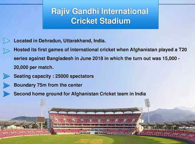 अफगानिस्तान क्रिकेट बोर्ड ने दून के राजीव गांधी अंतरराष्ट्रीय क्रिकेट स्टेडियम को अपना दूसरा होम ग्राउंड बनाया है।