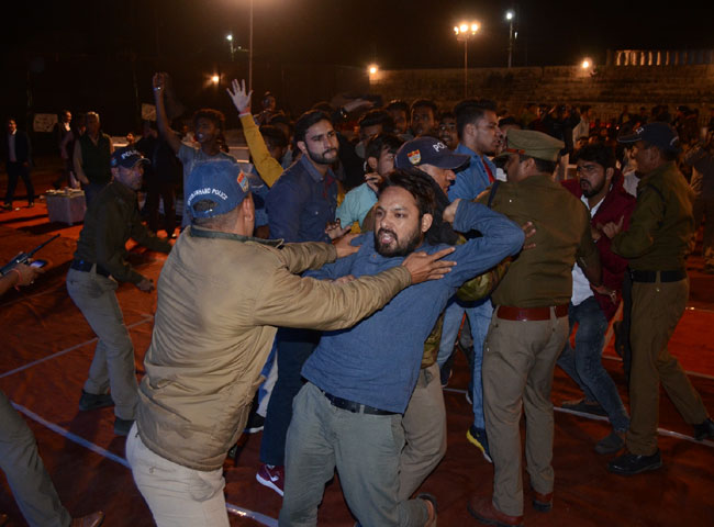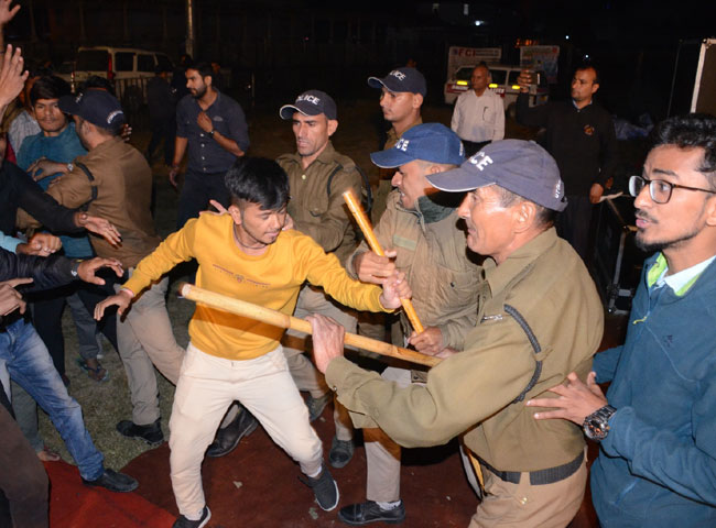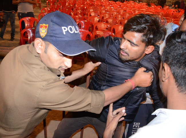 अचानक हुए इस घटनाक्रम से मौके पर मौजूद पुलिस अफसरों में भी अफरा-तफरी मच गई। पुलिस ने छात्रों को शांत करने की कोशिश की, लेकिन नारेबाजी बंद नहीं हुई। इस दौरान कुछ छात्रों ने मैदान में रखी कुर्सियां पलट दीं। हालात बिगड़ते देख पुलिस ने छात्रों को खदेडऩे के लिए लाठी फटकारना शुरू कर दिया। इस पर छात्रों और पुलिस के बीच धक्का-मुक्की हो गई। बड़ी मुश्किल से पुलिस ने छात्रों को मैदान के बाहर किया।