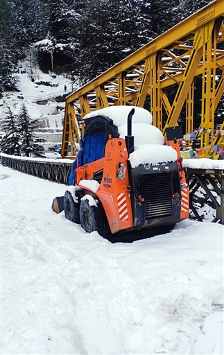 बर्फ की चादर ओढ़े हुए है ब्रिज, पहाड़ और पेड़ पौधे।