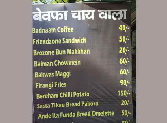'बेवफा चाय' की दुकान में मिलने वाली 'बकवास मैगी' प्रेमी जोड़ों की खास पसंद है। साथ ही प्यार में धोखा खाए युवा 'बेरहम चिली पोटेटो' का लुत्फ भी लेते हैं। 'अंडे का फंडा ऑमलेट' और 'फिरंगी फ्राइस' के शौकीन भी बड़ी तादाद में यहां पहुंचते हैं, जबकि दोस्तों काग्रुप यहां 'फ्रेंड्सजोन सैंडविच' का ऑर्डर कर सकता है।