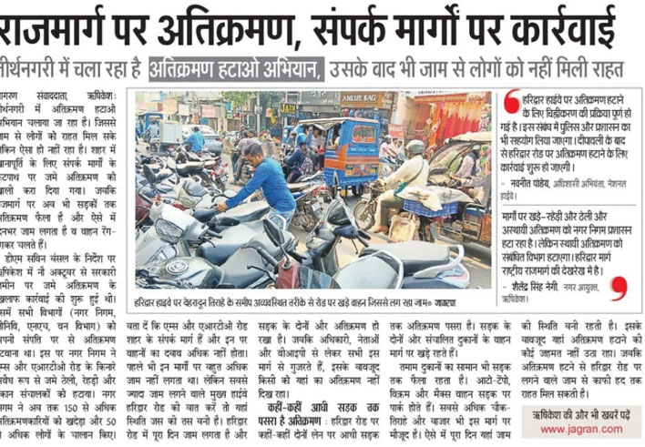 आज भी शहर के हरिद्वार राजमार्ग पर सड़क के दोनों ओर भारी अतिक्रमण जमा है और ऐसे में सबसे अधिक जाम भी इसी रोड पर लगता है। हाल यह है कि रोजाना इस रोड पर दिनभर वाहन रेंगकर गुजरते हैं। बुधवार के अंक में दैनिक जागरण ने इस मामले को ''राजमार्ग पर अतिक्रमण, संपर्क मार्गाें पर कार्रवाई'' के शीर्षक के साथ प्रमुखता से प्रकाशित किया।