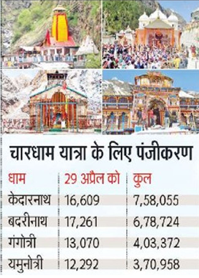 गंगोत्री और यमुनोत्री के कपाट 30 अप्रैल को खुलेंगे। जबकि दो मई को केदारनाथ और चार मई को बदरीनाथ धाम के कपाट खुलने के साथ यात्रा पूर्ण स्वरूप में शुरू हो जाएगी। आखिर में 25 मई को हेमकुंड साहिब के कपाट खोले जाएंगे। अब तक सर्वाधिक पंजीकरण केदारनाथ के लिए हुए हैं।