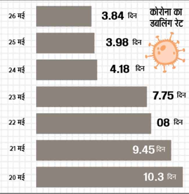 स्वास्थ्य विभाग की ओर से जारी आंकड़ों पर गौर करें तो प्रदेश में हफ्तेभर में कोरोना का डबलिंग रेट महज 3.84 दिन हो गया है। इससे पहले यहां कोरोना संक्रमण के डबल होने की दर 35 दिन थी।