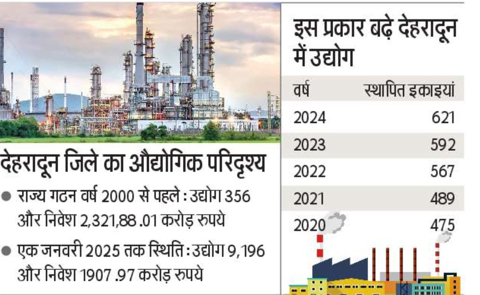 एक जनवरी 2024 से एक जनवरी 2025 के बीच देहरादून के अलग-अलग औद्योगिक क्षेत्रों में वैश्विक निवेशक सम्मेलन के तहत पंजीकृत 52 औद्योगिक घराने ने 4,375.51 करोड़ रुपये का निवेश किया है, जबकि जिला उद्योग केंद्र के माध्यम से 543 नए एमएसएमई उद्योगों ने 224.32 करोड़ रुपये का निवेश किया है। इसके अलावा 26 मध्यम उद्योगों का पंजीकरण उद्योग निदेशालय में कराया गया है।
